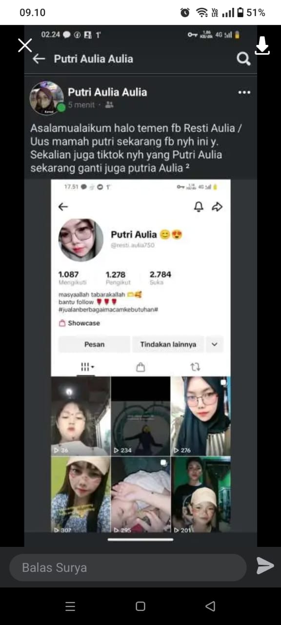 Serang – Diduga ingin menghancurkan nama baik dan rumah tangga seseorang, Oknum bernama Surya Batok diduga bajak akun Facebook dan Tiktok milik Resti Anggraeni, yang semula memiliki akun Fb bernama Restiaulia dan Tiktok Putri Aulia namun sekarang sudah di non aktifkan, Sabtu, (26/07/2025)