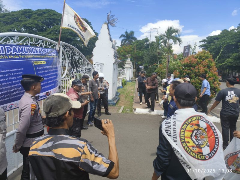 SERANG, – Perkumpulan Aktivis Muda Pengawal Kesejahteraan Masyarakat Banten yang tergabung dalam Aliansi Pamungkas Banten menggelar aksi unjuk rasa di depan Kantor Bupati Serang, Rabu (1/10/2025).