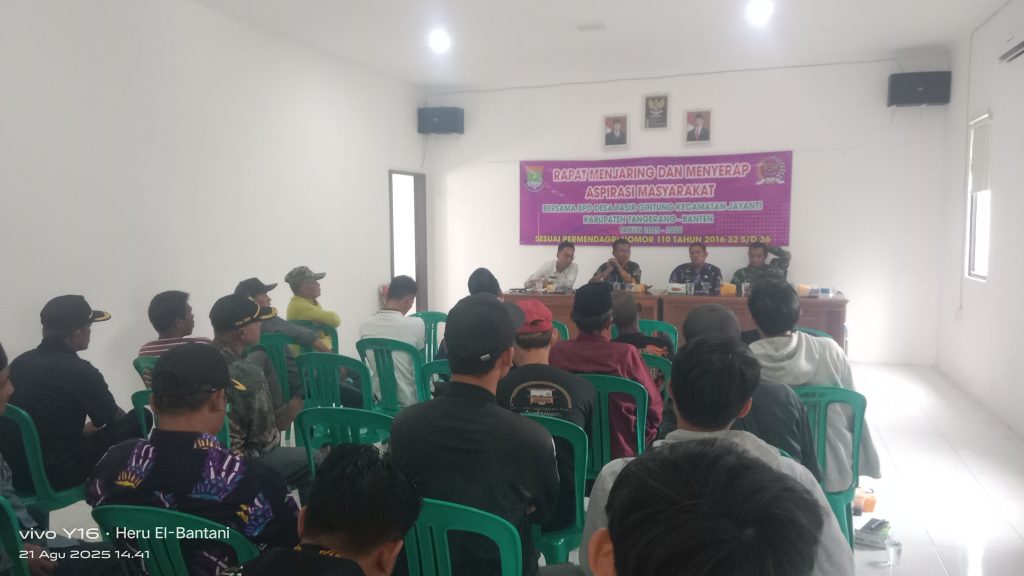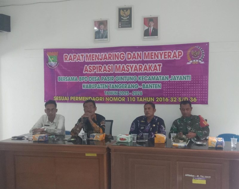 TANGERANG – Badan Permusyawaratan Desa (BPD) Desa Pasir Gintung, bersama Pemerintah Desa Pasir Gintung, dan Lembaga Desa, menggelar Rapat Aspirasi menggali, menampung serta menyalurkan aspirasi masyarakat, yang bertempat di Aula kantor Desa Pasir Gintung, Kecamatan Jayanti, Kabupaten Tangerang, Kamis, (21/06/2024).