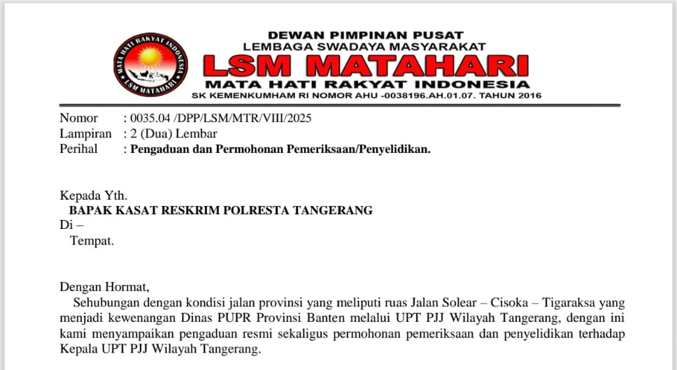 Tangerang – LSM Matahari mengajukan pengaduan resmi kepada Kasat Reskrim Polresta Tangerang terkait dugaan penyalahgunaan wewenang dan penyimpangan dalam penggunaan anggaran pemeliharaan jalan provinsi…