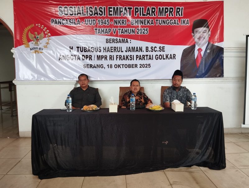 BANTEN – Bertempat di aula gedung serbaguna kelurahan Sumur Pecung, Kota Serang, Anggota DPR/MPR RI Komisi IX Fraksi Partai Golkar dari Daerah Pilihan Provinsi Banten II, H. Tubagus Haerul Jaman menggelar kegiatan sosialisasi empat pilar kebangsaan. (Sabtu,18/10/2025).