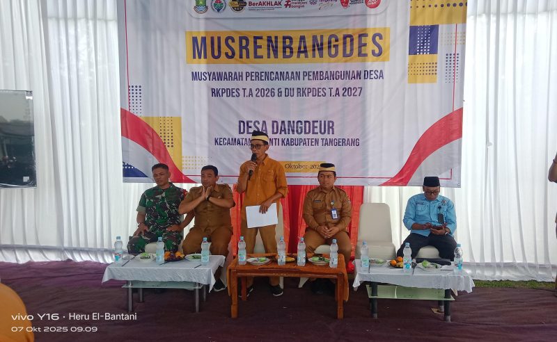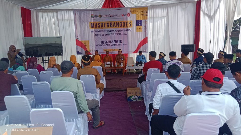 Tangerang – Musyawarah Perencanaan Pembangunan Desa (Musrenbangdes) Dangdeur untuk penyusunan Rencana Kerja Pemerintah Desa (RKPDes) Tahun Anggaran 2026 serta Daftar Usulan (DU) RKPDes Tahun Anggaran 2027, berlangsung sukses, lancar, dan aman pada Selasa (7/10/2025).