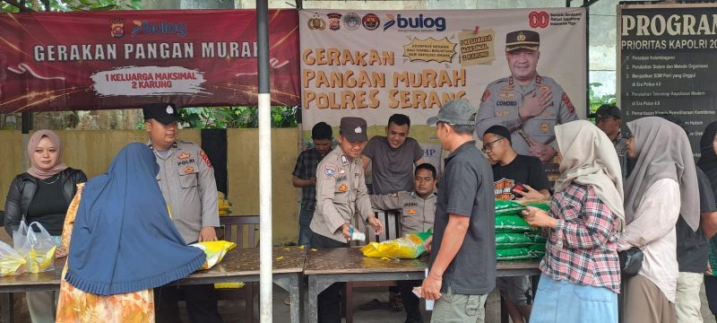 Serang – Bentuk Kepedulian, – Polres Serang mengadakan gerakan pangan murah berupa beras dan minyak goreng guna membantu meringankan daya beli masyarakat Jawilan.