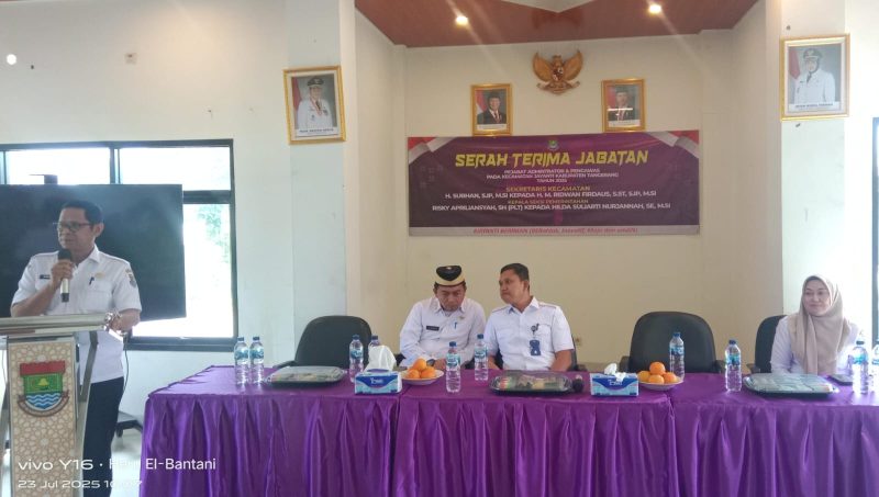 TANGERANG – Pemerintah Kecamatan Jayanti hari ini menggelar acara Serah Terima Jabatan (Sertijab) serta lepas sambut pejabat administrator dan pengawas yang berlangsung di aula kantor Kecamatan Jayanti, Kabupaten Tangerang Banten, Acara ini merupakan bagian dari proses rotasi, promosi, dan penyegaran organisasi di lingkungan Pemerintah Kabupaten, Tangerang, Rabu, (23/07/2025)