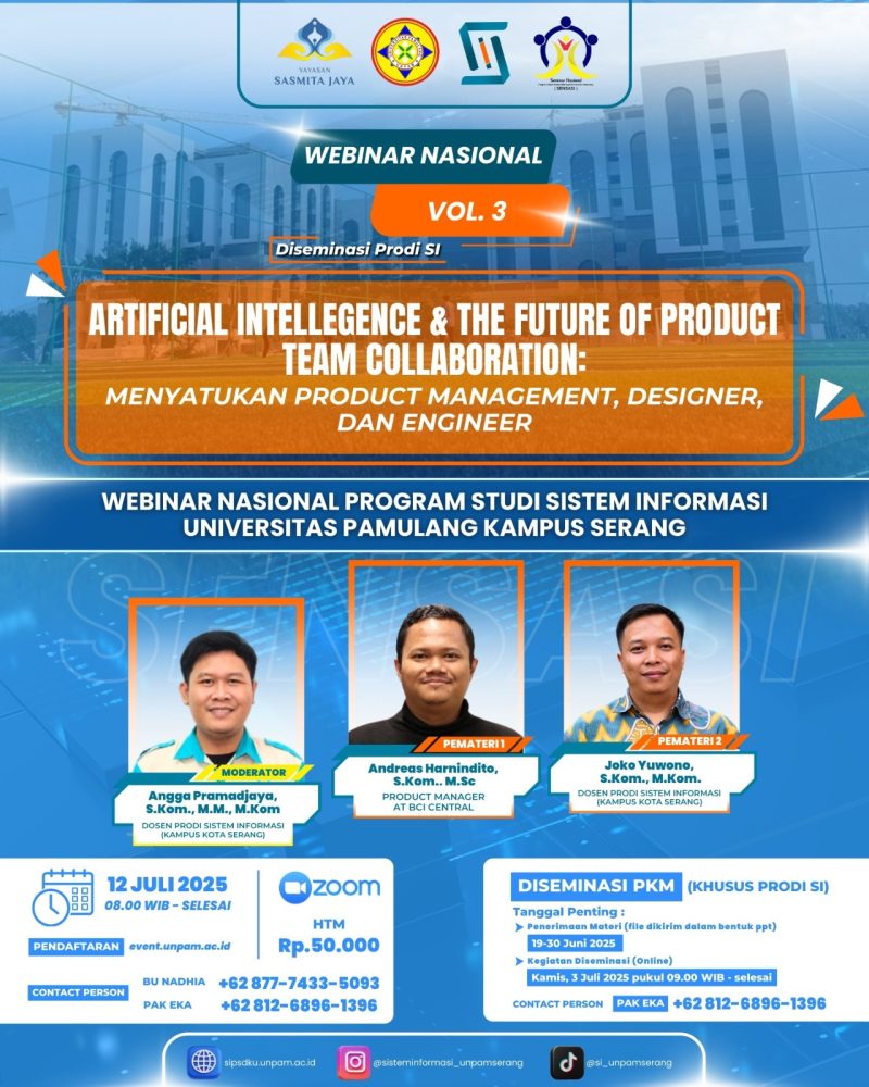 SERANGRAYA.ID | SERANG – Program Studi Sistem Informasi sukses menyelenggarakan Seminar Nasional Sistem Informasi 2025 secara daring melalui Zoom Meeting dengan tema besar : “Artificial Intelligence & The Future of Product Team Collaboration: Menyatukan Product Management, Designer, dan Engineer”.